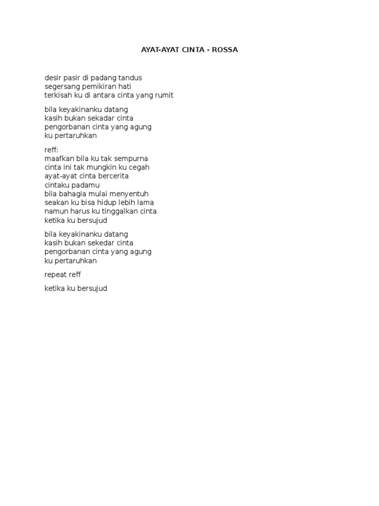 Ayat ayat cinta 2 lirik rossa. Cinta ini tak mungkin kucegah. Ketika kubersujud Bila keyakinanku datang. From Ayat-Ayat Cinta 2 soundtrack Andaikan kabut.