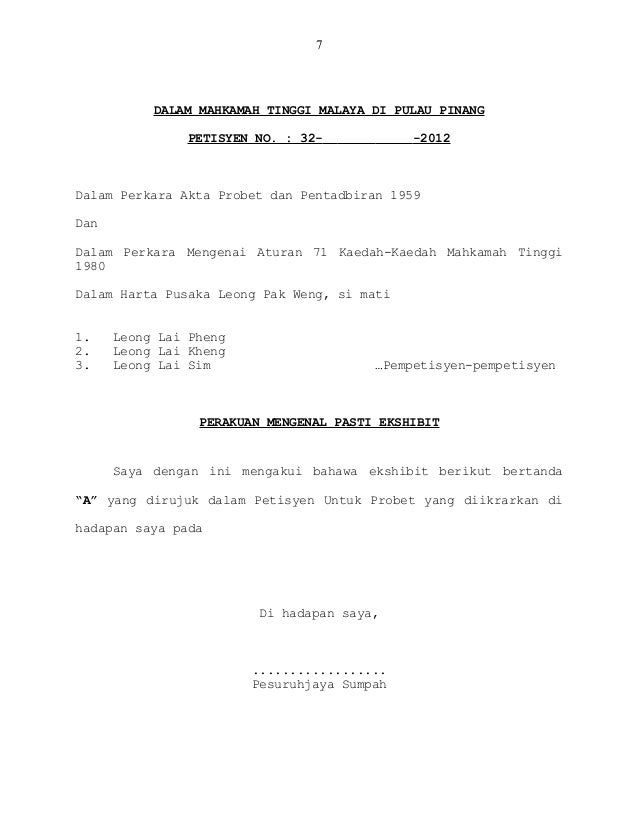 Kaedah Kaedah Mahkamah 2012. 32- -2012 Dalam Perkara Akta Probet dan Pentadbiran 1959 Dan Dalam Perkara Mengenai Aturan 71 Kaedah-Kaedah Mahkamah Tinggi 1980 Dalam Harta Pusaka Leong Pak Weng si mati 1. Permohonan Surat Probet jika si mati meninggalkan wasiat Permohonan di bawah Aturan 71 Kaedah- Kaedah Mahkamah 2012 Permohonan di bawah A71 Prosiding Probet Bukan Bertikaian boleh dibuat sekiranya tiada pertikaian antara waris-waris.