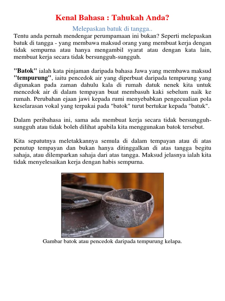 Perkataan batok pencedok dah di salah ertikan macam batuk sakit tujenuh jugak aku pikir dulu apa kaitan batuk kat tangga dengan buat kerja. Posted by Bahasaku indah at 1015 PG. Peribahasa yang mempunyai maksud yang sama seperti pepatah ini.