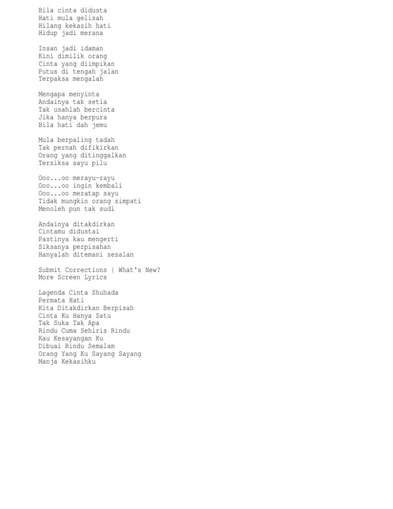 Tak pernah difikirkan orang yang ditinggalkan. Insan jadi idaman Kini dimilik orang Cinta yang diimpikan Putus ditengah jalan. Lirik lagu Screen - Bila Cinta Didusta - Bila cinta didusta Hati mula gelisah Hilang kekasih hati Hidup jadi merana Insan jadi idaman Kini dimilik orang Cinta yang diimpikan Putus di tengah jalan Terpaksa mengalah Mengapa menyinta Andainya tak setia Tak usahlah bercin.