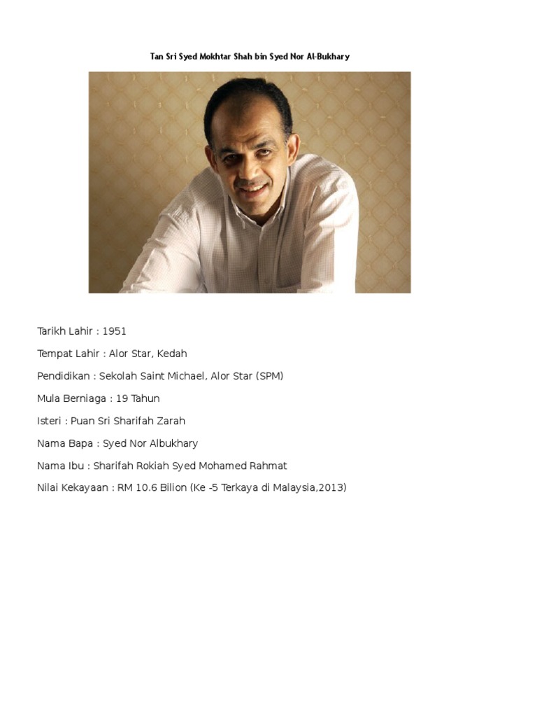 Tan Sri Syed Mokhtar Shah Bin Syed Nor Al-Bukhary Syed Mokhtar al-bukhary the third of seven children born into a middle-low class of Hadhram Arab ancestry his father was a trader who had. Tan Sri Syed Mokhtar Shah bin Syed Nor Al-Bukhary Tan Sri Syed Mokhtar Shah bin Syed Nor Al-Bukhary is one of the richest Bumiputra corporate figure in. His full name is Syed Mokhtar Shah bin Syed Nor Al-Bukhary.