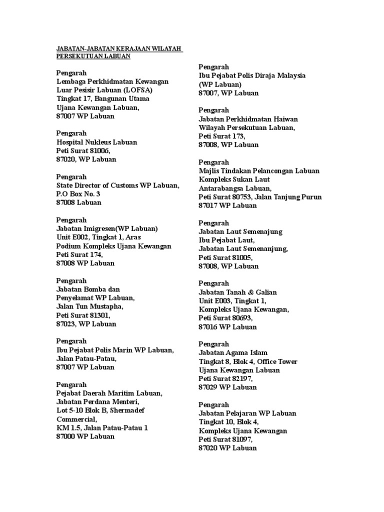 Jabatan Perikanan Negeri Wilayah Persekutuan. Jabatan Agama Islam Wilayah Persekutuan Kompleks Pusat Islam Jalan Perdana 50676 Kuala Lumpur Tel. Majlis Agama Islam Wilayah Persekutuan Cawangan Labuan MAIWP Blok 4 Tingkat 13 Kompleks Ujana Kewangan Peti Surat 80960 87019 LABUAN Baitulmal MAIWP Operating as usual.