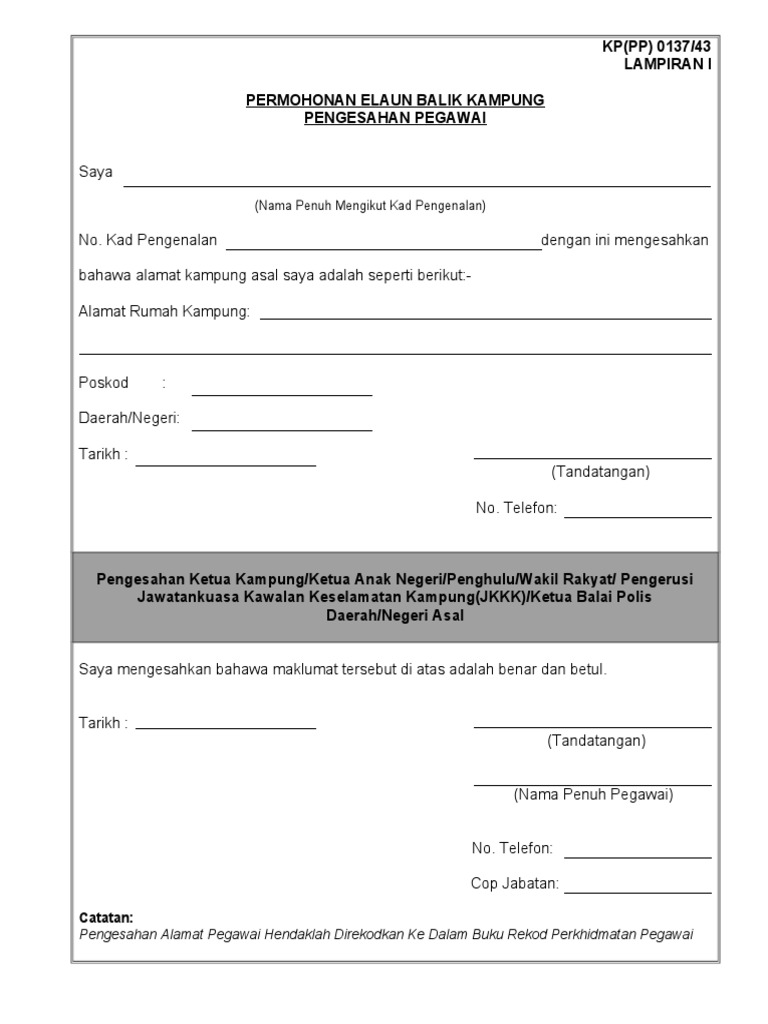Borang permohonan elaun balik kampung. O Scribd é o maior site social de leitura e publicação do mundo. BORANG LAMPIRAN A-TUGAS LUAR PEJABAT KOSONG 2015pdf. Descubra tudo o que o Scribd tem a oferecer incluindo livros e audiolivros de grandes editoras.