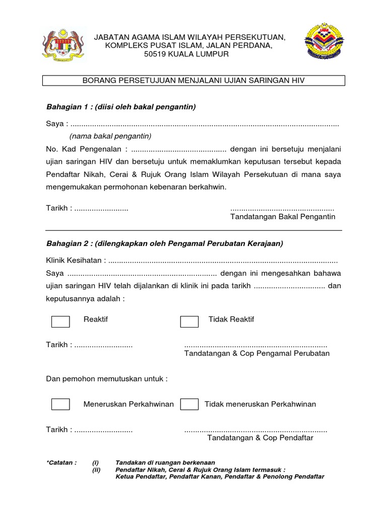 Saya bersetuju untuk menjalani ujian saringan HIV dan keputusan ujian dikembalikan kepada Pejabat Agama Daerah. Jabatan Agama Islam Wilayah Persekutuan Kompleks Pusat Islam Jalan Perdana 50676 Kuala Lumpur Tel. Nama bakal pengantin Nama bakal pengantin Alamat semasa Sila nyatakan BORANG KEMENTERIAN KESIHATAN MALAYSIA BORANG PERMOHONAN UJIAN SARINGAN HIV.