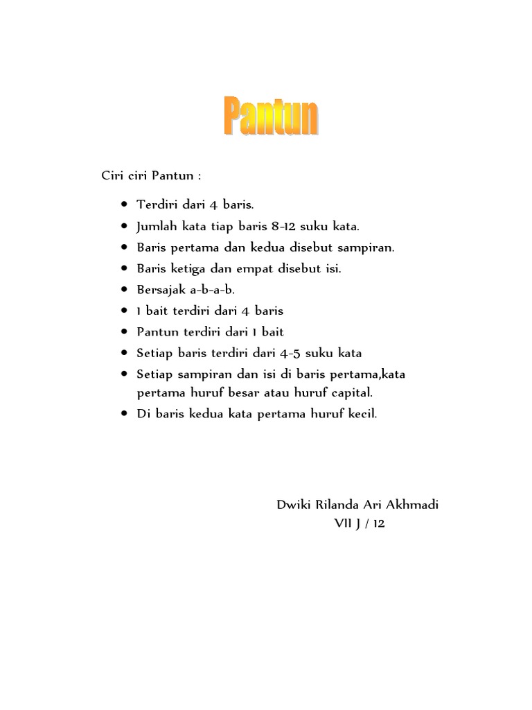 Pantun berasal dari bahasa Minangkabau yaitu patuntun yang memiliki arti penuntun. Ciri ciri pantun sangat mudah dipelajari. Ciri sebuah pantun memiliki bait setiap bait pada sebuah pantun disusun oleh barisâbaris.