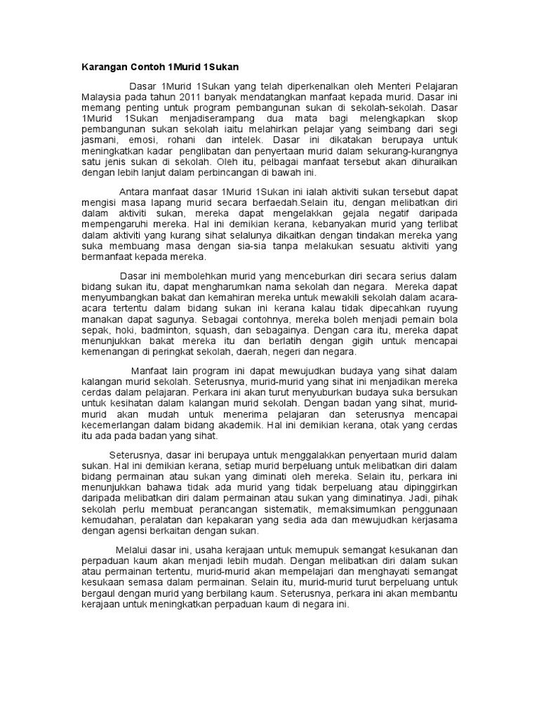 Karangan 1murid 1sukan. Program 1Murid 1Sukan yang telah diperkenalkan oleh Kementerian Pelajaran banyak memberikan manfaat kepada murid. Malaysia sebuah negara yang megah berdiri di persada dunia seiring dengan keagungan namanyaKecekapan pemerintah yang mentadbir negara ibarat menarik rambut di dalam tepung telah berjaya melahirkan remaja yang intelek dan berinovasi sehingga dunia memandang ke arah negara kitaNamun remaja pada hari ini terlalu.