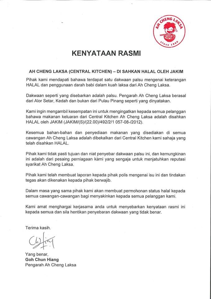 Walau bagaimanapun _central kitchen_ bagi premis makanan berkenaan yang didaftar atas nama Ah Cheng Laksa Sdn Bhd di lokasi Taman Perindustrian USJ 1 Subang Jaya Selangor telah dipersijilkan halal. Untuk makluman premis makanan Ah Cheng Laksa masih belum menjadi pemegang Sijil Pengesahan Halal Malaysia. Ini juga bagi mengelakkan kekeliruan status halal dapat diatasi dengan berkesan.
