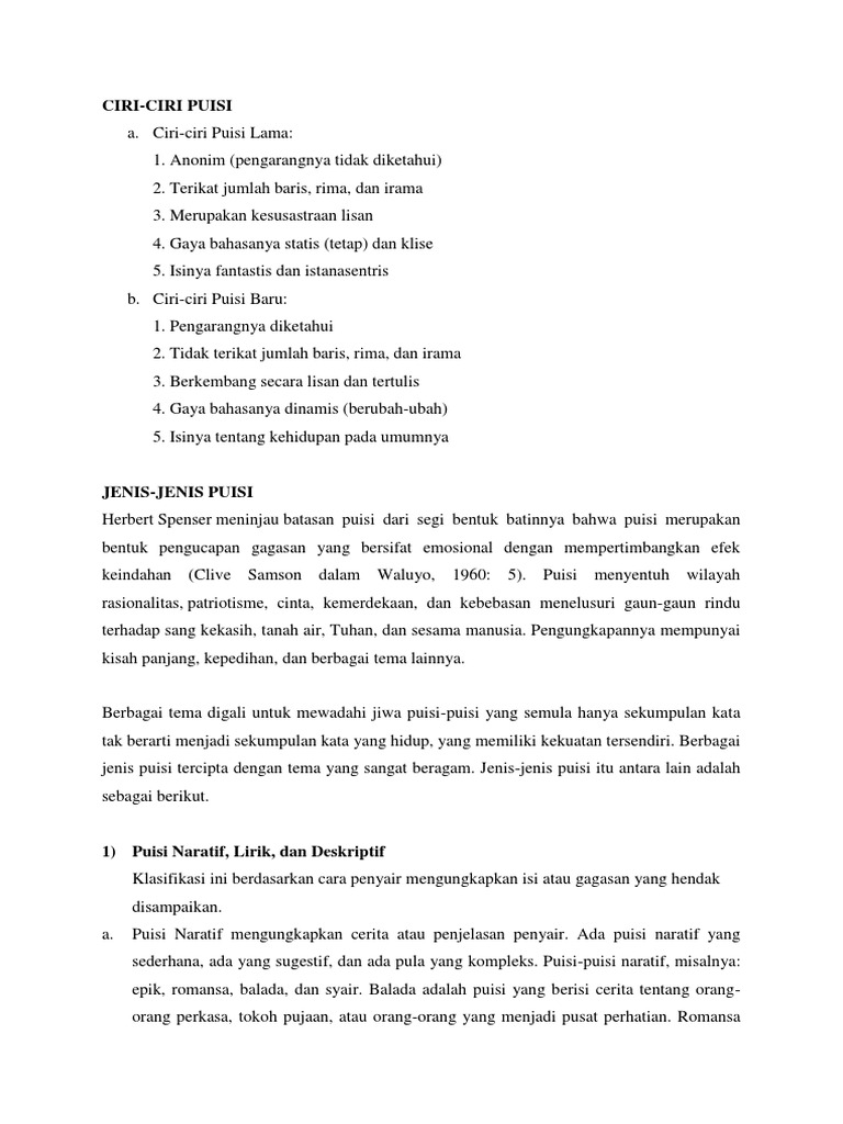 Ada beberapa jenis puisi rakyat di Indonesia sejak masa sastra Melayu lama. Diksi adalah kata-kata yang telah dipilih oleh seorang penyair untuk dimasukkan kedalam puisinya. Apa Itu Puisi.