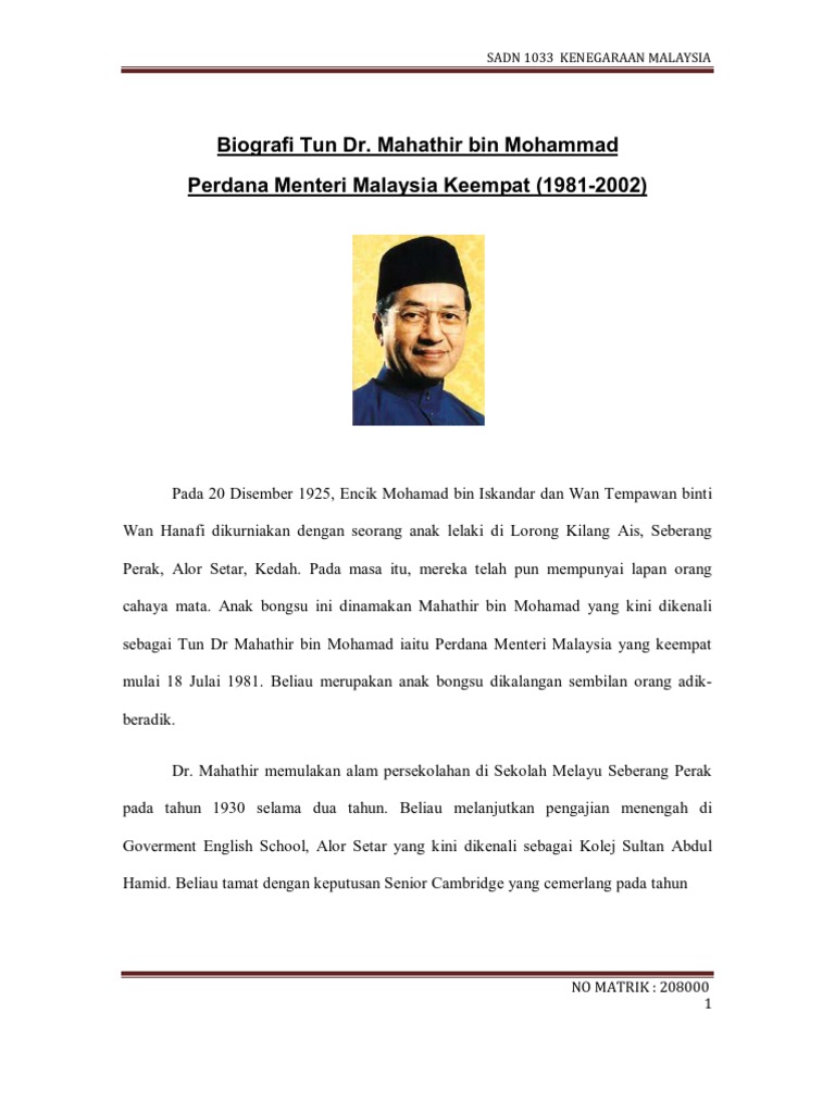 Dr Mahathir Latar Belakang Tun Dr Mahathir Bin Mohamad Yang Juga Digelar Sebagai Dr M Dan Nama Penanya Che Det Dilahirkan Pada 20 Disember 1925 Di Course Hero