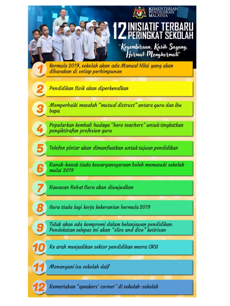 Dengan peruntukkan itu terdapat 12 inisiatif secara langsung yang akan dilaksanakan pada tahun depan. 12 Inisiatif Terbaru Peringkat Sekolah Kementerian Pendidikan Bumi Gemilang. 12 Inisiatif Kpm Untuk Sekolah Menjelang 2019 Guru.