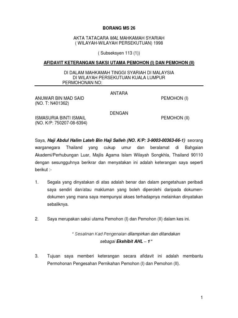 BORANG MS 26 AKTA TATACARA MAL MAHKAMAH SYARIAH WILAYAH-WILAYAH PERSEKUTUAN 1998 Subseksyen 113 1 AFIDAVIT DALAM MAHKAMAH TINGGI SYARIAH DI MALAYSIA DI DALAM WILAYAH PERSEKUTUAN PUTRAJAYA PERMOHONAN NO. Direktori Mahkamah Syariah Hubungan. Tarikh Persetujuan Diraja.