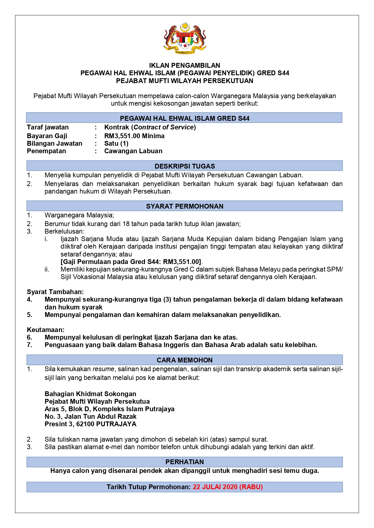 Pejabat Mufti Wilayah Persekutuan Iklan Pengambilan Pegawai Hal Ehwal Islam Pegawai Penyelidik Gred S44 Pejabat Mufti Wilayah Persekutuan