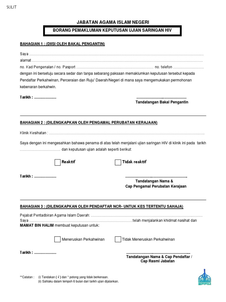 Menjalani ujian saringan HIV dan bersetuju untuk memaklumkan keputusan tersebut kepada Pegawai Hal Ehwal Agama Islam Negeri Kelantan Pendaftar Nikah Cerai Rujuk Orang Islam Negeri Kelantan di mana saya mengemukakan permohonan kebenaran berkahwin. 800 pagi - 330 petang Rehat. BORANG PERMOHONAN UJIAN SARINGAN HIV PRA PERKAHWINAN BAHAGIAN 1.