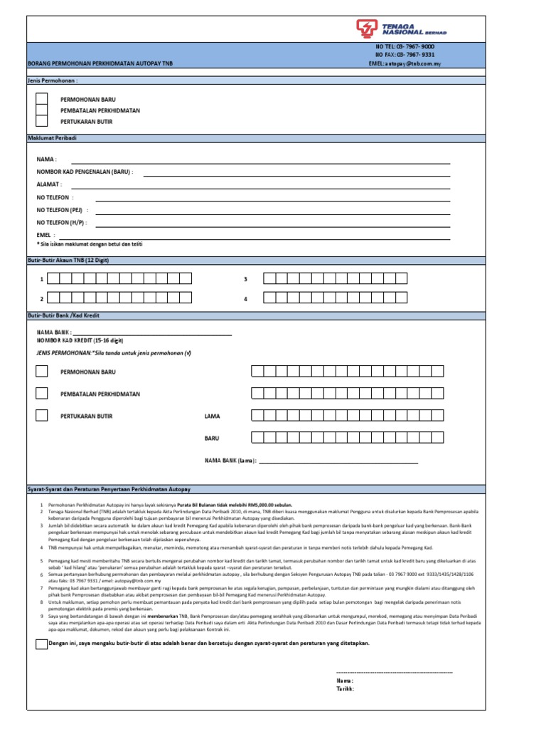 Borang Permohonan Perkhidmatan Autopay Tnb