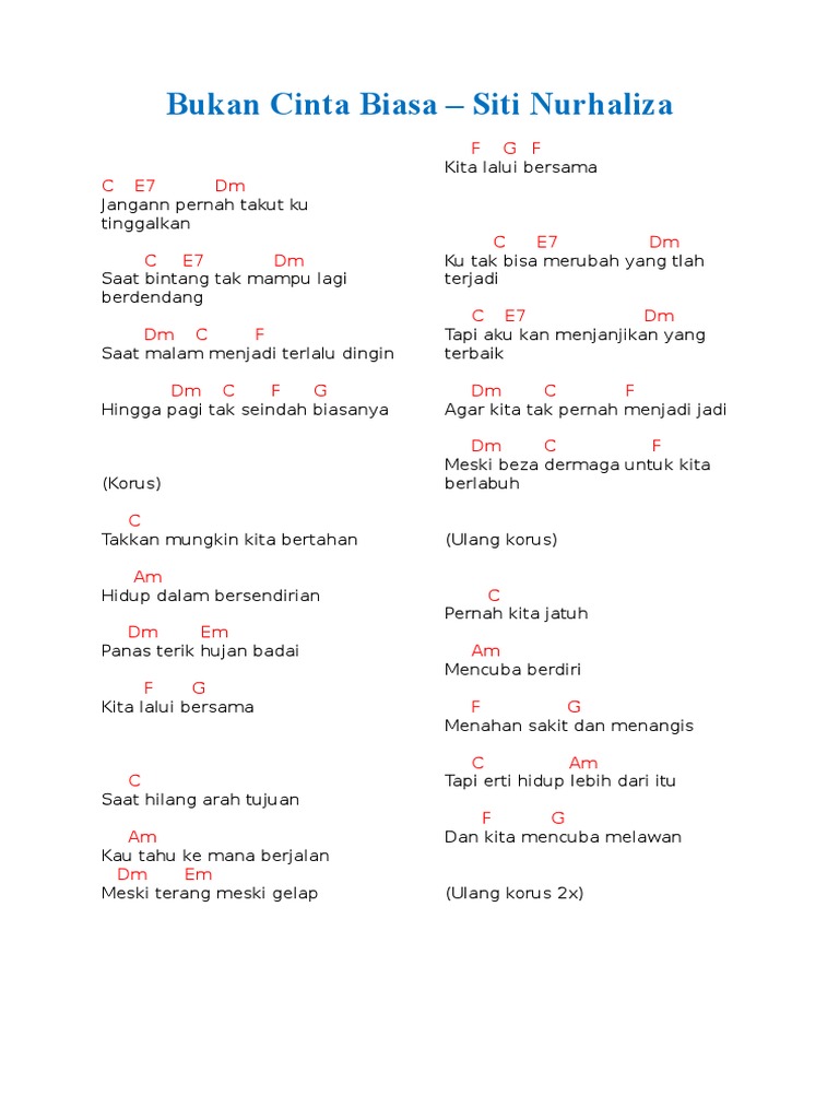 Bukan cinta biasa lirik dan chord. G Am D G -DF Em A Dsus4 D. Lirik dan Chord Lagu Bukan Cinta Biasa dari Siti Nurhaliza. G Am Begitu banyak cerita D G Ada suka ada duka Em Am Cinta yang ingin ku tulis C D Bukanlah cinta biasa.